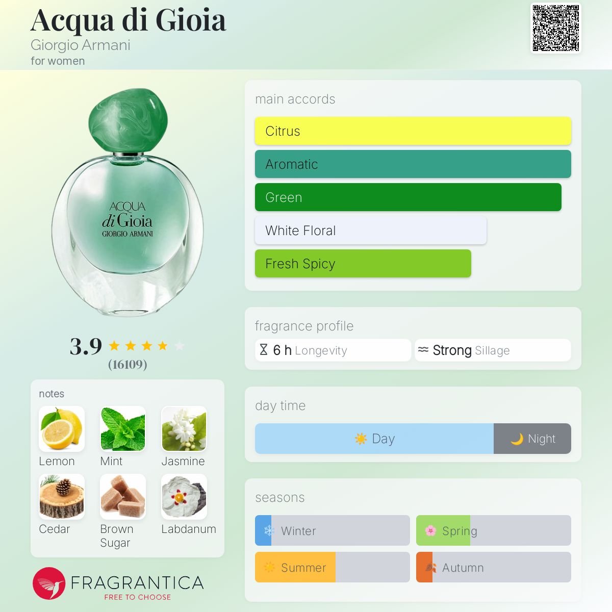 The fragrance arrives on the market in June 2010 as a blend of refreshing notes of crushed mint leaves and lemon Limone Primo Fiore Femminello from Calabria. Structure of the composition pushes the limits from fresh citruses to a floral heart which encompasses aquatic jasmine, dewy peony and pink pepper, while a base closes with cedar, yellow sugar and labdanum. Acqua di Gioia was created by three perfumers: Loc Dong, Anne Flipo and Dominique Ropion, who see it as Eve’s seduction and as fragrance turned completely towards the nature.