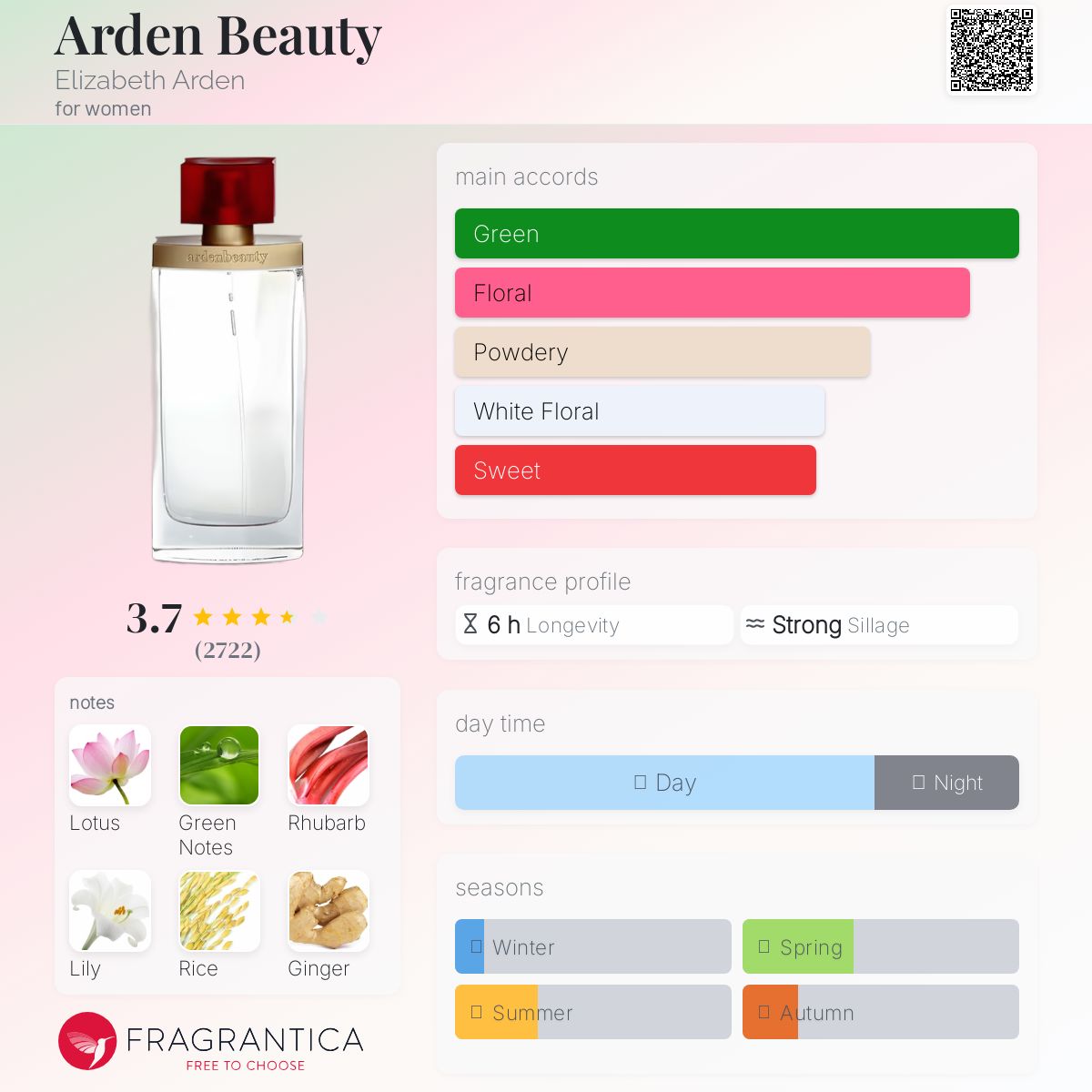Arden Beauty by Elizabeth Arden is a Floral Green fragrance for women. Arden Beauty was launched in 2002. The nose behind this fragrance is Antoine Lie. Top notes are Green Notes, Rice Flower, Iris and Bergamot; middle notes are Lotus, Rhubarb, Lily, Ginger and Orchid; base notes are Musk, Sandalwood and Amber.