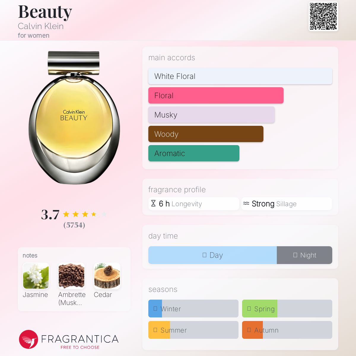 Elegance, sophistication, timelessness and beauty are in the first plan. The perfume is ideal for mature women who choose models from Calvin Klein collection and enjoy style and spirit of Klein collections. Beauty is a fragrance representing woman in her 40es, her beauty, maturity and self-esteem.