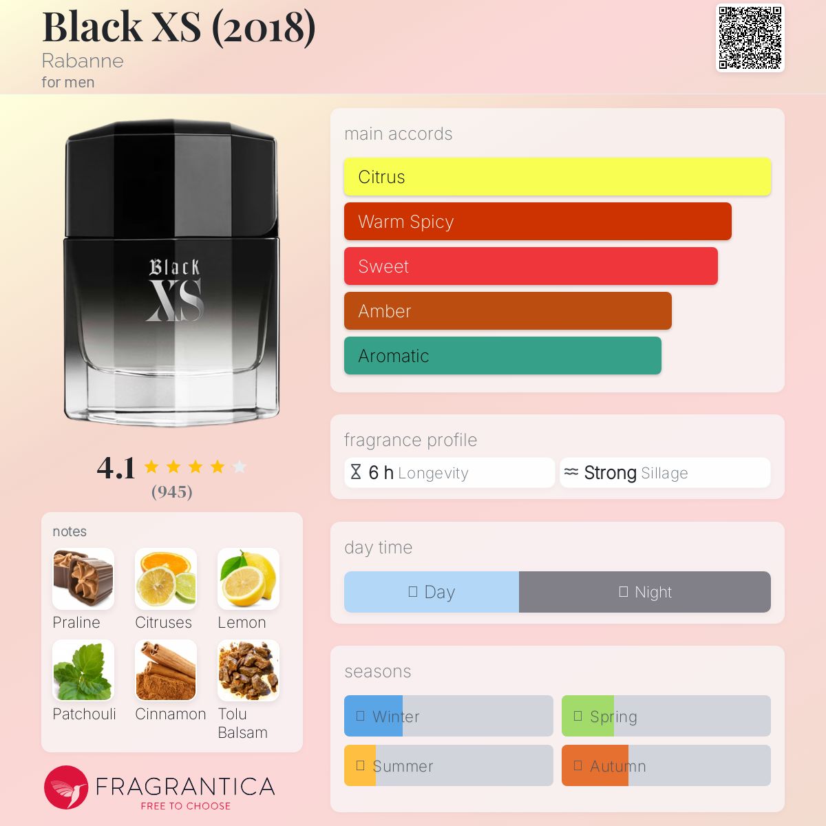 Black XS (2018) by Rabanne is a Oriental Woody fragrance for men. Black XS (2018) was launched in 2018. Black XS (2018) was created by Olivier Cresp and Rosendo Mateu. Top notes are Citruses, Lemon, Sage and Marigold; middle notes are Praline, Cinnamon, Tolu Balsam and Black Cardamom; base notes are Patchouli, Black Amber, ebony tree and Palisander Rosewood.