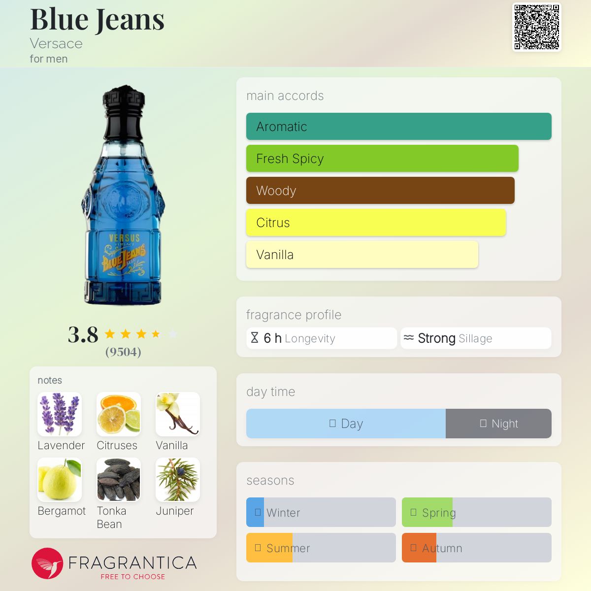 Blue Jeans is a fragrance one always goes back to. A classic masculine fragrance with woodsy, citrusy notes with a spicy heart and a warm drydown. Top notes are composed of bergamot, lemon, anise, basil and palisander tree. Geranium, rose, lavender, jasmine, sage, heliotrope and lily are at its heart. The drydown contains the notes of iris, sandalwood, vetiver, musk, patchouli, Tonka bean, vanilla and amber. Blue Jeans was created in 1994.