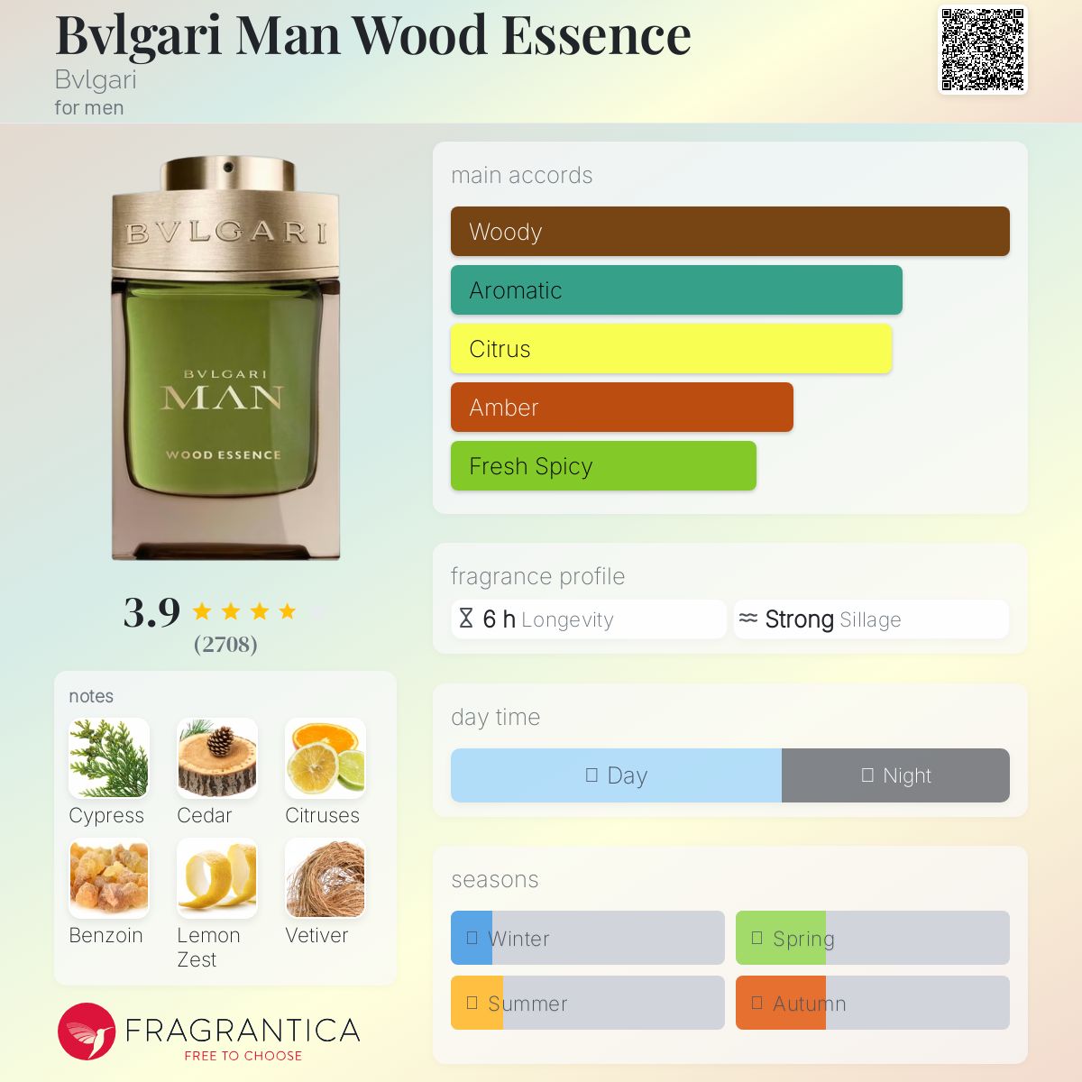 Bvlgari Man Wood Essence combines an accord of woods – wood barks, resins and essences – mixed with spicy notes. Italian citrus zest along with coriander leaf gives a fresh, green character in the opening, leading to an intense woody cypress, vetiver and cedar accord based on benzoin resins.