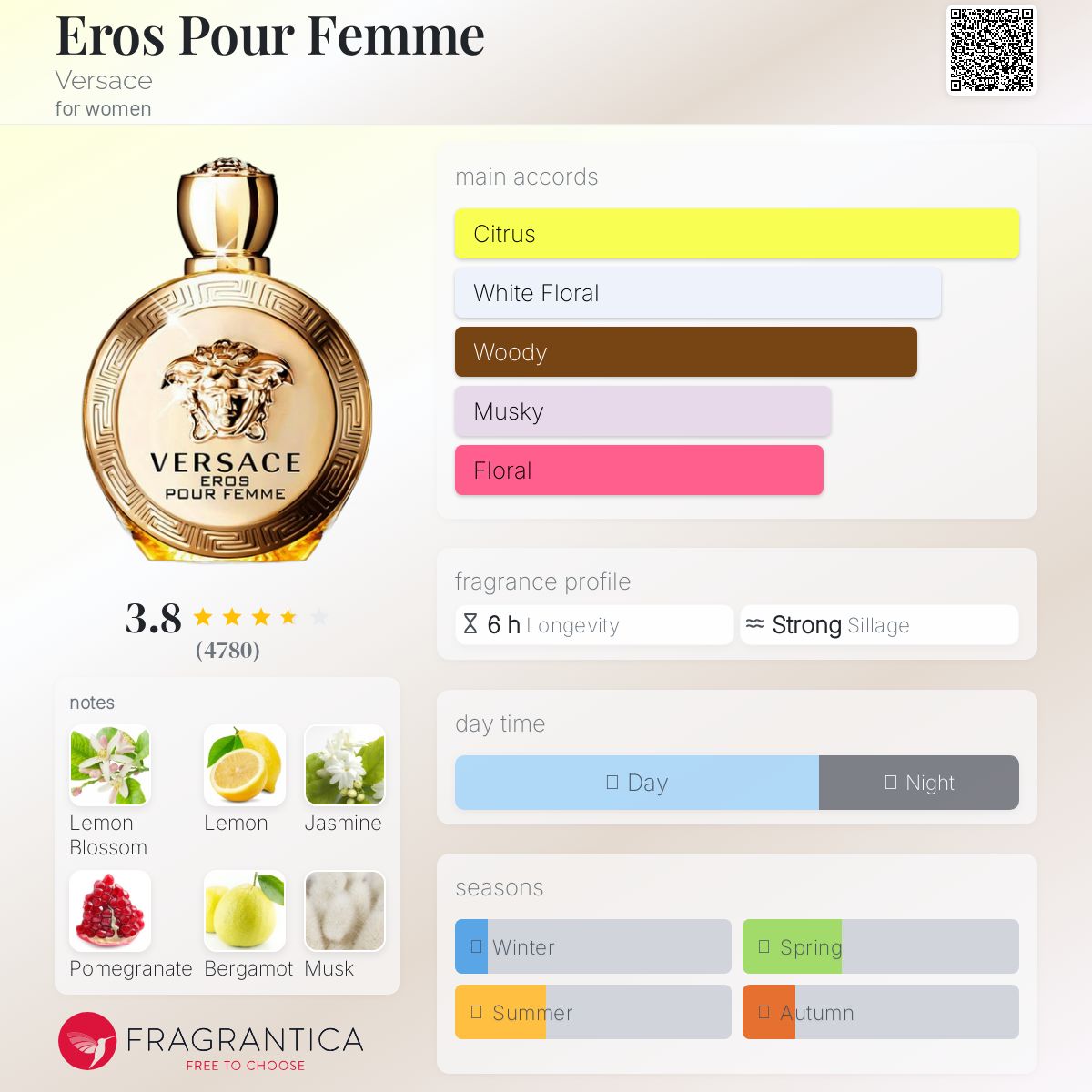Eros Pour Femme by Versace is a Floral Woody Musk fragrance for women. Eros Pour Femme was launched in 2014. Eros Pour Femme was created by Alberto Morillas, Olivier Cresp and Nathalie Lorson. Top notes are Sicilian Lemon, Pomegranate and Calabrian bergamot; middle notes are Lemon Blossom, Jasmine Sambac, Jasmine and Peony; base notes are Musk, Ambroxan, Woodsy Notes and Sandalwood.