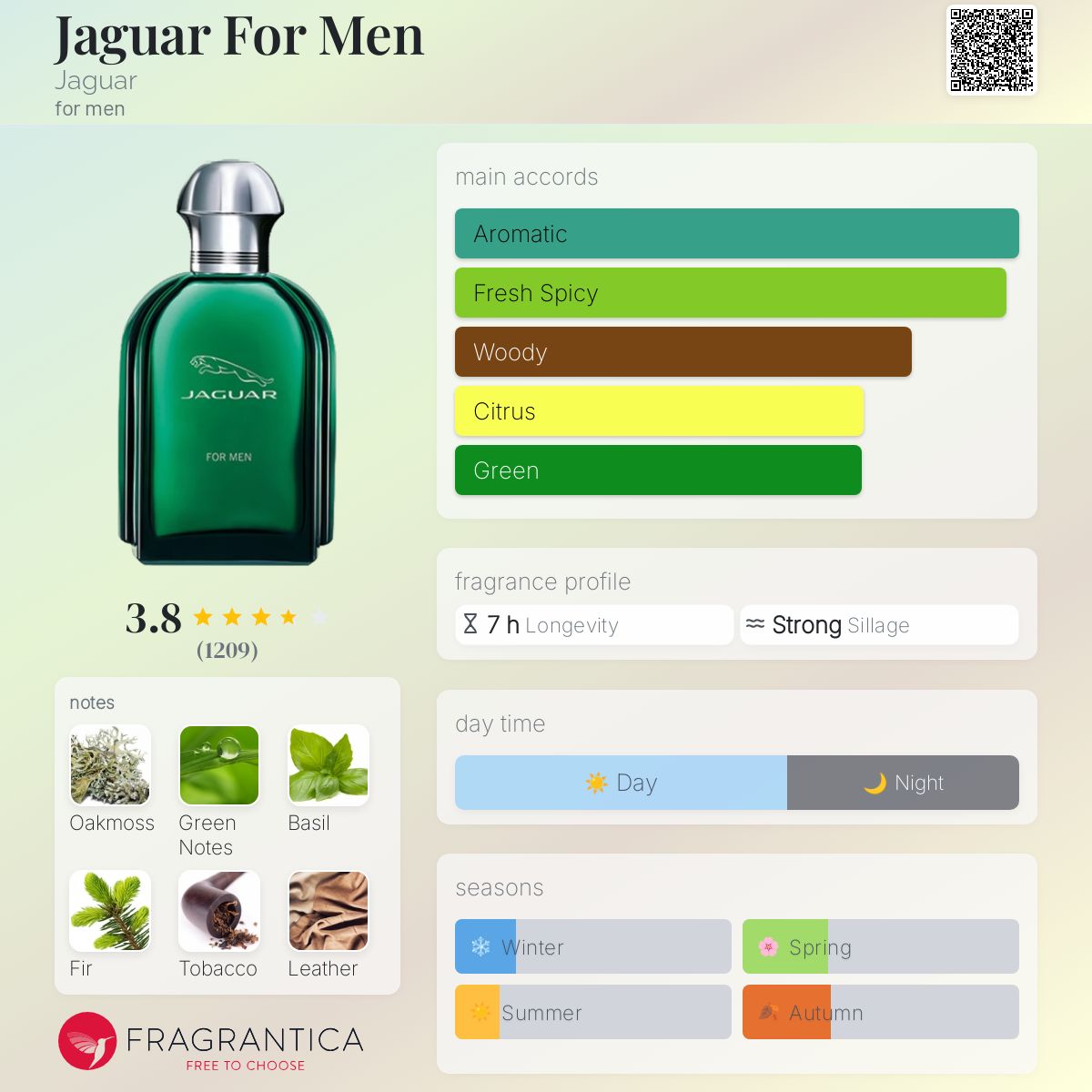 Jaguar For Men by Jaguar is a Aromatic fragrance for men. Jaguar For Men was launched in 1988. The nose behind this fragrance is Dominique Preyssas. Top notes are Green Notes, Basil, Orange, Grapefruit, Lavender, Cassia, Mandarin Orange, Bergamot, Thyme and Anise; middle notes are Fir, Carnation, Nutmeg, Sage, Caraway, Geranium, Cinnamon, Cyclamen, Rose, Gardenia and Jasmine; base notes are Oakmoss, Tobacco, Leather, Cedar, Fern, Patchouli, Sandalwood, Musk, Amber, Tonka Bean and Vanilla.